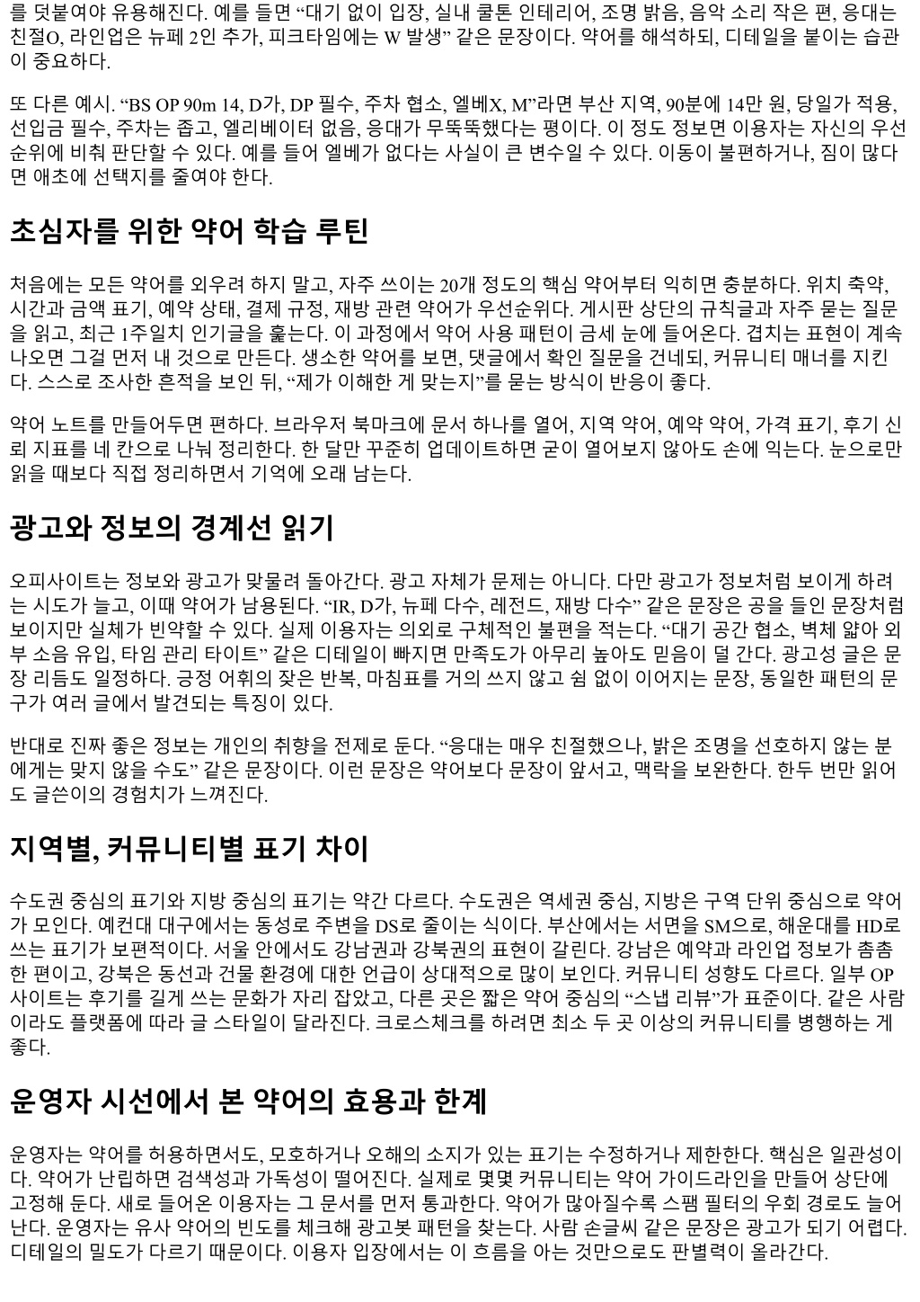 를덧붙여야유용해진다. 예를들면 “대기없이입장, 실내쿨톤인테리어, 조명밝음, 음악소리작은편, 응대는 친절O, 라인업은뉴페 2인추가, 피크타임에는 W 발생” 같은문장이다. 약어를해석하되, 디테일을붙이는습관 이중요하다. 또다른예시. “BS OP 90m 14, D가, DP 필수, 주차협소, 엘베X, M”라면부산지역, 90분에 14만원, 당일가적용, 선입금필수, 주차는좁고, 엘리베이터없음, 응대가무뚝뚝했다는평이다. 이정도정보면이용자는자신의우선 순위에비춰판단할수있다. 예를들어엘베가없다는사실이큰변수일수있다. 이동이불편하거나, 짐이많다 면애초에선택지를줄여야한다. 초심자를위한약어학습루틴 처음에는모든약어를외우려하지말고, 자주쓰이는 20개정도의핵심약어부터익히면충분하다. 위치축약, 시간과금액표기, 예약상태, 결제규정, 재방관련약어가우선순위다. 게시판상단의규칙글과자주묻는질문 을읽고, 최근 1주일치인기글을훑는다. 이과정에서약어사용패턴이금세눈에들어온다. 겹치는표현이계속 나오면그걸먼저내것으로만든다. 생소한약어를보면, 댓글에서확인질문을건네되, 커뮤니티매너를지킨 다. 스스로조사한흔적을보인뒤, “제가이해한게맞는지”를묻는방식이반응이좋다. 약어노트를만들어두면편하다. 브라우저북마크에문서하나를열어, 지역약어, 예약약어, 가격표기, 후기신 뢰지표를네칸으로나눠정리한다. 한달만꾸준히업데이트하면굳이열어보지않아도손에익는다. 눈으로만 읽을때보다직접정리하면서기억에오래남는다. 광고와정보의경계선읽기 오피사이트는정보와광고가맞물려돌아간다. 광고자체가문제는아니다. 다만광고가정보처럼보이게하려 는시도가늘고, 이때약어가남용된다. “IR, D가, 뉴페다수, 레전드, 재방다수” 같은문장은공을들인문장처럼 보이지만실체가빈약할수있다. 실제이용자는의외로구체적인불편을적는다. “대기공간협소, 벽체얇아외 부소음유입, 타임관리타이트” 같은디테일이빠지면만족도가아무리높아도믿음이덜간다. 광고성글은문 장리듬도일정하다. 긍정어휘의잦은반복, 마침표를거의쓰지않고쉼없이이어지는문장, 동일한패턴의문 구가여러글에서발견되는특징이있다. 반대로진짜좋은정보는개인의취향을전제로둔다. “응대는매우친절했으나, 밝은조명을선호하지않는분 에게는맞지않을수도” 같은문장이다. 이런문장은약어보다문장이앞서고, 맥락을보완한다. 한두번만읽어 도글쓴이의경험치가느껴진다. 지역별, 커뮤니티별표기차이 수도권중심의표기와지방중심의표기는약간다르다. 수도권은역세권중심, 지방은구역단위중심으로약어 가모인다. 예컨대대구에서는동성로주변을 DS로줄이는식이다. 부산에서는서면을 SM으로, 해운대를 HD로 쓰는표기가보편적이다. 서울안에서도강남권과강북권의표현이갈린다. 강남은예약과라인업정보가촘촘 한편이고, 강북은동선과건물환경에대한언급이상대적으로많이보인다. 커뮤니티성향도다르다. 일부 OP 사이트는후기를길게쓰는문화가자리잡았고, 다른곳은짧은약어중심의 “스냅리뷰”가표준이다. 같은사람 이라도플랫폼에따라글스타일이달라진다. 크로스체크를하려면최소두곳이상의커뮤니티를병행하는게 좋다. 운영자시선에서본약어의효용과한계 운영자는약어를허용하면서도, 모호하거나오해의소지가있는표기는수정하거나제한한다. 핵심은일관성이 다. 약어가난립하면검색성과가독성이떨어진다. 실제로몇몇커뮤니티는약어가이드라인을만들어상단에 고정해둔다. 새로들어온이용자는그문서를먼저통과한다. 약어가많아질수록스팸필터의우회경로도늘어 난다. 운영자는유사약어의빈도를체크해광고봇패턴을찾는다. 사람손글씨같은문장은광고가되기어렵다. 디테일의밀도가다르기때문이다. 이용자입장에서는이흐름을아는것만으로도판별력이올라간다.