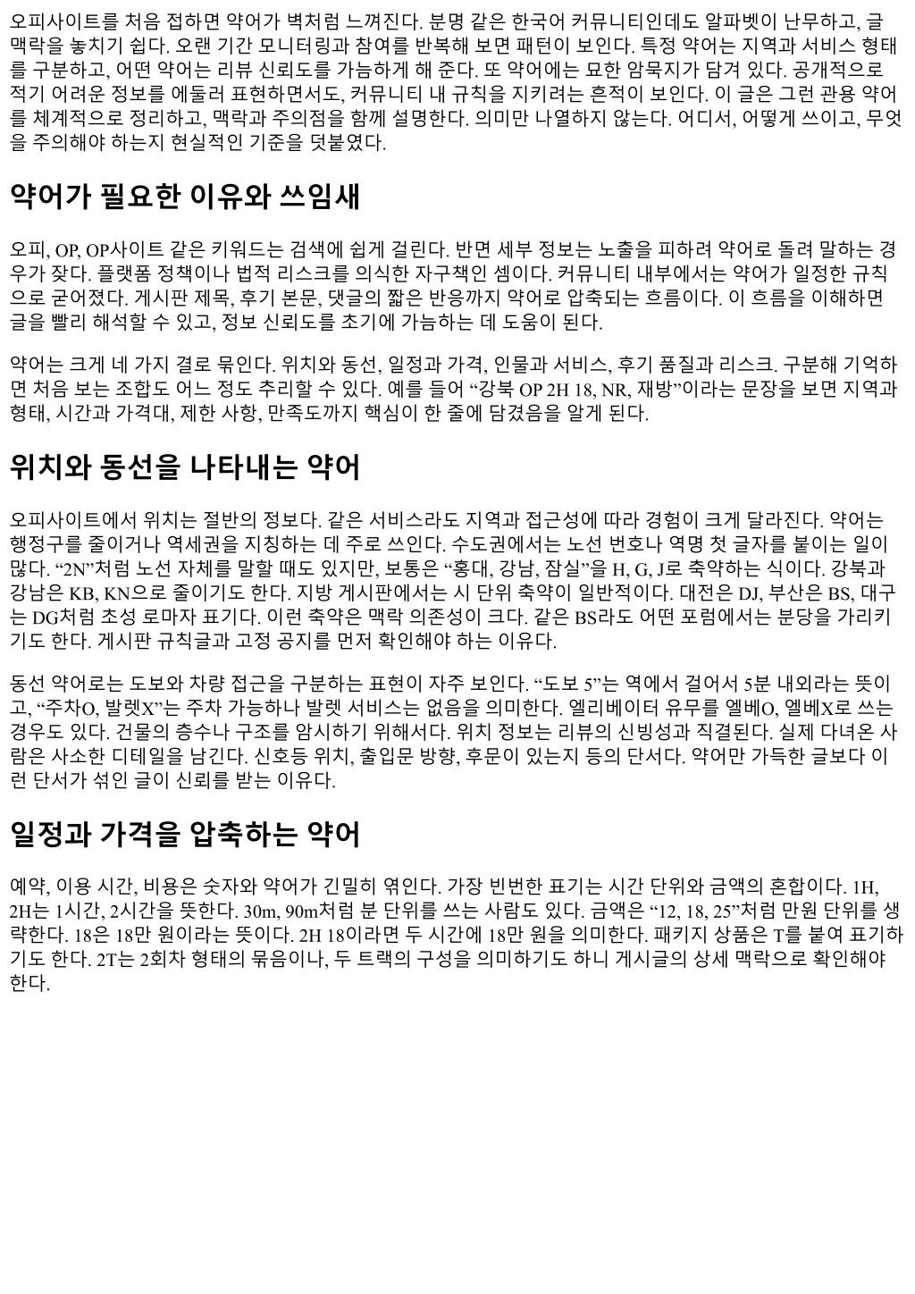 오피사이트를처음접하면약어가벽처럼느껴진다. 분명같은한국어커뮤니티인데도알파벳이난무하고, 글 맥락을놓치기쉽다. 오랜기간모니터링과참여를반복해보면패턴이보인다. 특정약어는지역과서비스형태 를구분하고, 어떤약어는리뷰신뢰도를가늠하게해준다. 또약어에는묘한암묵지가담겨있다. 공개적으로 적기어려운정보를에둘러표현하면서도, 커뮤니티내규칙을지키려는흔적이보인다. 이글은그런관용약어 를체계적으로정리하고, 맥락과주의점을함께설명한다. 의미만나열하지않는다. 어디서, 어떻게쓰이고, 무엇 을주의해야하는지현실적인기준을덧붙였다. 약어가필요한이유와쓰임새 오피, OP, OP사이트같은키워드는검색에쉽게걸린다. 반면세부정보는노출을피하려약어로돌려말하는경 우가잦다. 플랫폼정책이나법적리스크를의식한자구책인셈이다. 커뮤니티내부에서는약어가일정한규칙 으로굳어졌다. 게시판제목, 후기본문, 댓글의짧은반응까지약어로압축되는흐름이다. 이흐름을이해하면 글을빨리해석할수있고, 정보신뢰도를초기에가늠하는데도움이된다. 약어는크게네가지결로묶인다. 위치와동선, 일정과가격, 인물과서비스, 후기품질과리스크. 구분해기억하 면처음보는조합도어느정도추리할수있다. 예를들어 “강북 OP 2H 18, NR, 재방”이라는문장을보면지역과 형태, 시간과가격대, 제한사항, 만족도까지핵심이한줄에담겼음을알게된다. 위치와동선을나타내는약어 오피사이트에서위치는절반의정보다. 같은서비스라도지역과접근성에따라경험이크게달라진다. 약어는 행정구를줄이거나역세권을지칭하는데주로쓰인다. 수도권에서는노선번호나역명첫글자를붙이는일이 많다. “2N”처럼노선자체를말할때도있지만, 보통은 “홍대, 강남, 잠실”을 H, G, J로축약하는식이다. 강북과 강남은 KB, KN으로줄이기도한다. 지방게시판에서는시단위축약이일반적이다. 대전은 DJ, 부산은 BS, 대구 는 DG처럼초성로마자표기다. 이런축약은맥락의존성이크다. 같은 BS라도어떤포럼에서는분당을가리키 기도한다. 게시판규칙글과고정공지를먼저확인해야하는이유다. 동선약어로는도보와차량접근을구분하는표현이자주보인다. “도보 5”는역에서걸어서 5분내외라는뜻이 고, “주차O, 발렛X”는주차가능하나발렛서비스는없음을의미한다. 엘리베이터유무를엘베O, 엘베X로쓰는 경우도있다. 건물의층수나구조를암시하기위해서다. 위치정보는리뷰의신빙성과직결된다. 실제다녀온사 람은사소한디테일을남긴다. 신호등위치, 출입문방향, 후문이있는지등의단서다. 약어만가득한글보다이 런단서가섞인글이신뢰를받는이유다. 일정과가격을압축하는약어 예약, 이용시간, 비용은숫자와약어가긴밀히엮인다. 가장빈번한표기는시간단위와금액의혼합이다. 1H, 2H는 1시간, 2시간을뜻한다. 30m, 90m처럼분단위를쓰는사람도있다. 금액은 “12, 18, 25”처럼만원단위를생 략한다. 18은 18만원이라는뜻이다. 2H 18이라면두시간에 18만원을의미한다. 패키지상품은 T를붙여표기하 기도한다. 2T는 2회차형태의묶음이나, 두트랙의구성을의미하기도하니게시글의상세맥락으로확인해야 한다.