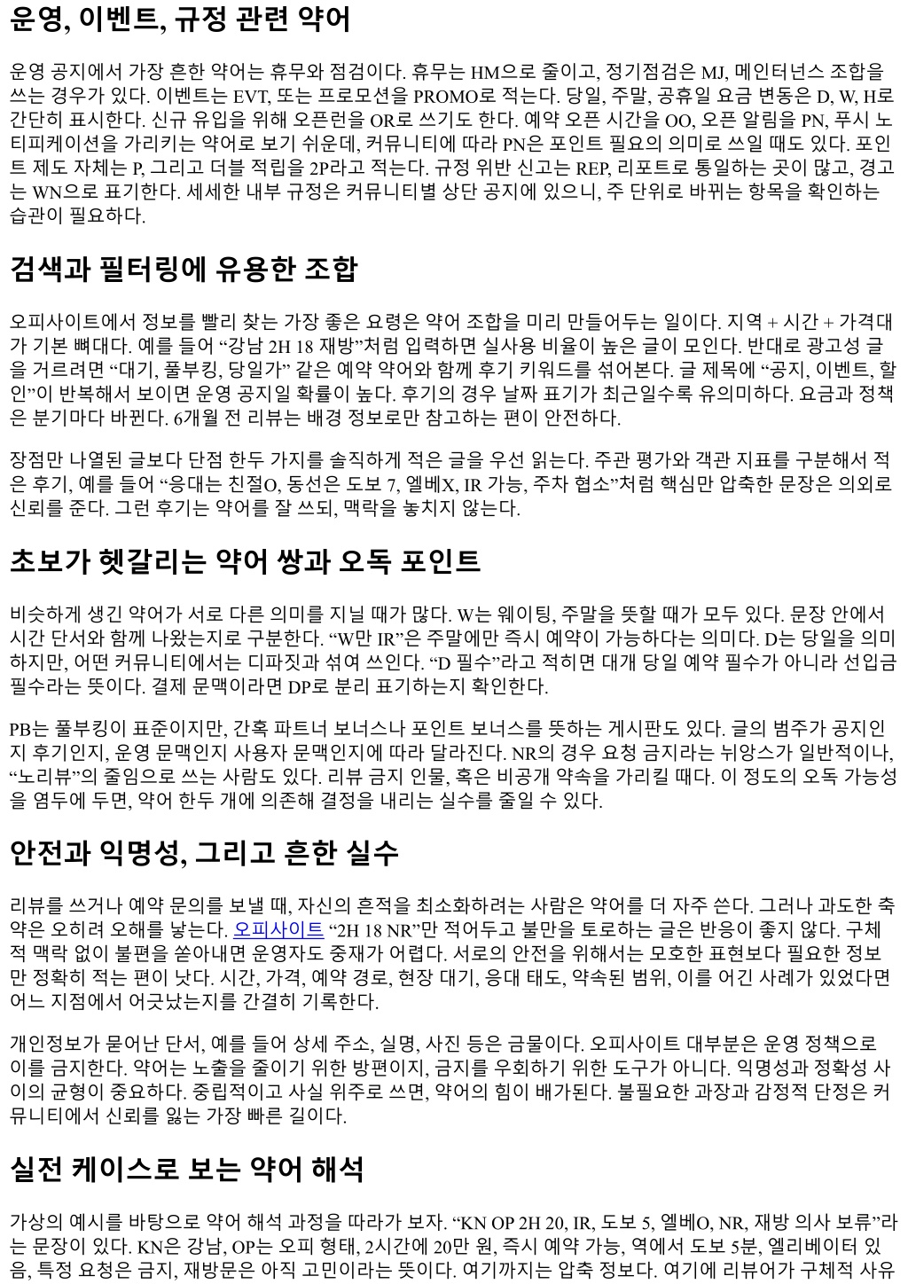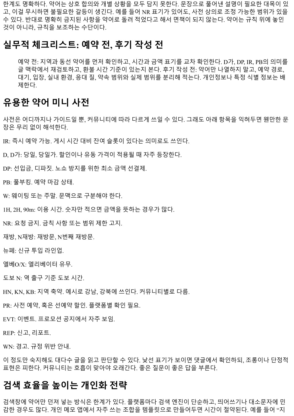한계도명확하다. 약어는상호합의와개별상황을모두담지못한다. 문장으로풀어낸설명이필요한대목이있 고, 이걸무시하면불필요한갈등이생긴다. 예를들어 NR 표기가있어도, 사전상의로조정가능한범위가있을 수있다. 반대로명확히금지된사항을약어로돌려적었다고해서면책이되지않는다. 약어는규칙위에놓인 것이아니라, 규칙을보조하는수단이다. 실무적체크리스트: 예약전, 후기작성전 예약전: 지역과동선약어를먼저확인하고, 시간과금액표기를교차확인한다. D가, DP, IR, PB의의미를 글맥락에서재검토하고, 환불시간기준이있는지본다. 후기작성전: 약어만나열하지말고, 예약경로, 대기, 입장, 실내환경, 응대질, 약속범위와실제범위를분리해적는다. 개인정보나특정식별정보는배 제한다. 유용한약어미니사전 사전은어디까지나가이드일뿐, 커뮤니티에따라다르게쓰일수있다. 그래도아래항목을익혀두면웬만한문 장은무리없이해석한다. IR: 즉시예약가능. 게시시간대비잔여슬롯이있다는의미로도쓰인다. D, D가: 당일, 당일가. 할인이나유동가격이적용될때자주등장한다. DP: 선입금, 디파짓. 노쇼방지를위한최소금액선결제. PB: 풀부킹. 예약마감상태. W: 웨이팅또는주말. 문맥으로구분해야한다. 1H, 2H, 90m: 이용시간. 숫자만적으면금액을뜻하는경우가많다. NR: 요청금지. 금칙사항또는범위제한고지. 재방, N재방: 재방문, N번째재방문. 뉴페: 신규투입라인업. 엘베O/X: 엘리베이터유무. 도보 N: 역출구기준도보시간. HN, KN, KB: 지역축약. 예시로강남, 강북에쓰인다. 커뮤니티별로다름. PR: 사전예약, 혹은선예약할인. 플랫폼별확인필요. EVT: 이벤트. 프로모션공지에서자주보임. REP: 신고, 리포트. WN: 경고. 규정위반안내. 이정도만숙지해도대다수글을읽고판단할수있다. 낯선표기가보이면댓글에서확인하되, 조롱이나단정적 표현은피한다. 커뮤니티는호흡이맞아야오래간다. 좋은질문이좋은답을부른다. 검색효율을높이는개인화전략 검색창에약어만던져넣는방식은한계가있다. 플랫폼마다검색엔진이단순하고, 띄어쓰기나대소문자에민 감한경우도많다. 개인메모앱에서자주쓰는조합을템플릿으로만들어두면시간이절약된다. 예를들어 “지