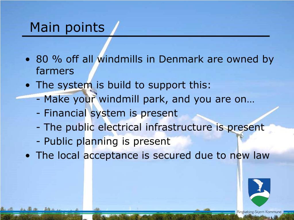 Main points • 80 % off all windmills in Denmark are owned by farmers • The system is build to support this: - Make your windmill park, and you are on… - Financial system is present - The public electrical infrastructure is present - Public planning is present • The local acceptance is secured due to new law