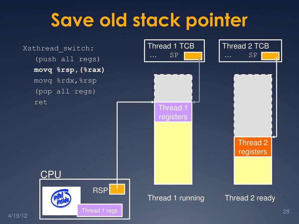 Save old stack pointer Thread 1 TCB … SP Thread 2 TCB … SP Xsthread_switch: (push all regs) movq %rsp,(%rax) movq %rdx,%rsp (pop all regs) ret Thread 1 registers Thread 2 registers CPU RSP Thread 1 running Thread 2 ready Thread 1 regs