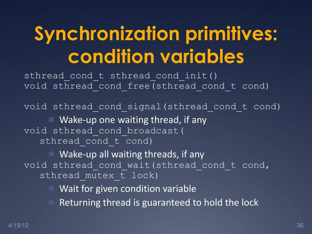 Synchronization primitives: condition variables • sthread_cond_t sthread_cond_init() • void sthread_cond_free(sthread_cond_t cond) • void sthread_cond_signal(sthread_cond_t cond) • Wake-up one waiting thread, if any • void sthread_cond_broadcast( • sthread_cond_t cond) • Wake-up all waiting threads, if any • void sthread_cond_wait(sthread_cond_t cond, • sthread_mutex_t lock) • Wait for given condition variable • Returning thread is guaranteed to hold the lock