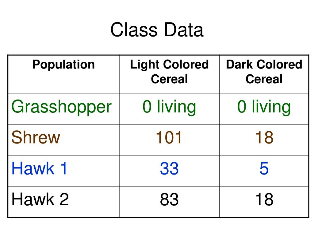 Return to your seats… • All living animals should count the contents of their stomachs. • Count & record # light colored cereal • Count & record # of dark colored cereal Count them up!