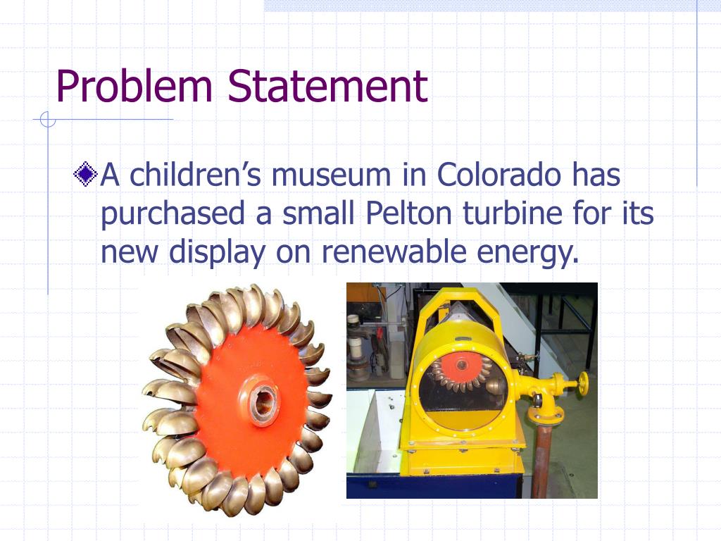 Problem Statement • A children’s museum in Colorado has purchased a small Pelton turbine for its new display on renewable energy.