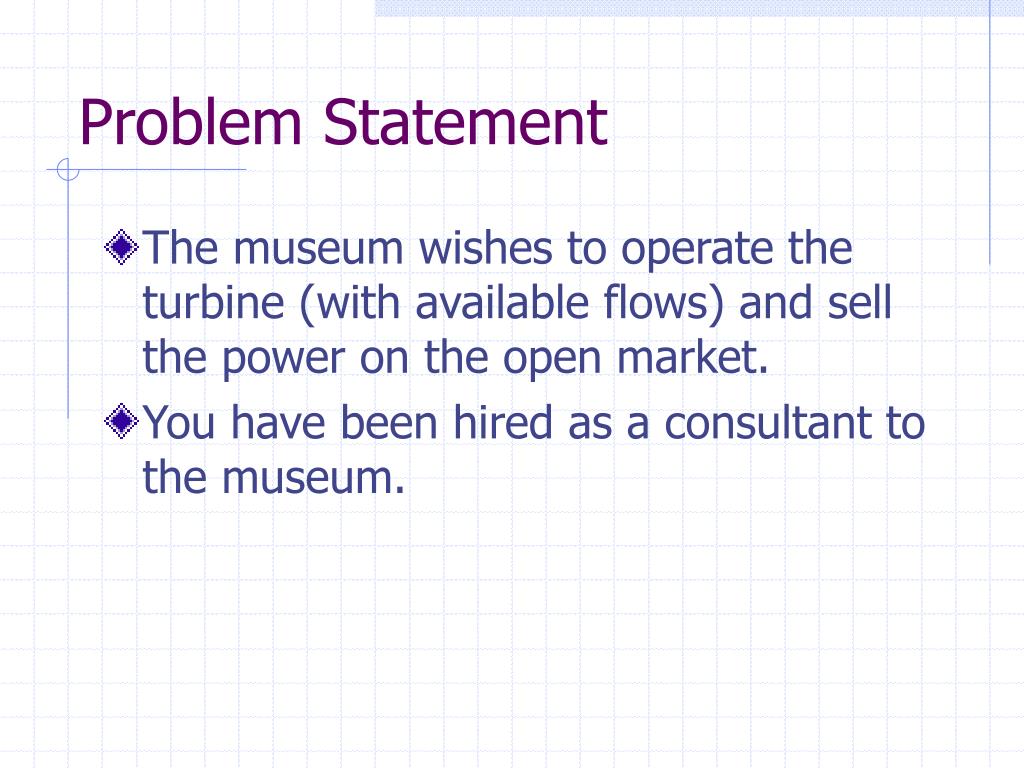 Problem Statement • The museum wishes to operate the turbine (with available flows) and sell the power on the open market. • You have been hired as a consultant to the museum.