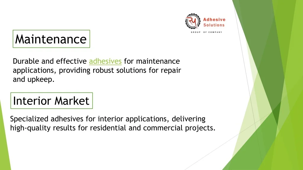 Maintenance Durable and effective adhesives for maintenance applications, providing robust solutions for repair and upkeep. Interior Market Specialized adhesives for interior applications, delivering high-quality results for residential and commercial projects.