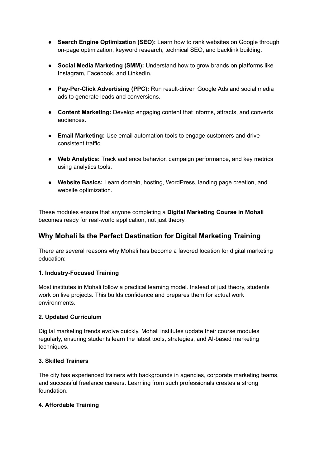 2. ● Search Engine Optimization (SEO): Learn how to rank websites on Google through on-page optimization, keyword research, technical SEO, and backlink building. ● Social Media Marketing (SMM): Understand how to grow brands on platforms like Instagram, Facebook, and LinkedIn. ● Pay-Per-Click Advertising (PPC): Run result-driven Google Ads and social media ads to generate leads and conversions. ● Content Marketing: Develop engaging content that informs, attracts, and converts audiences. ● Email Marketing: Use email automation tools to engage customers and drive consistent traffic. ● Web Analytics: Track audience behavior, campaign performance, and key metrics using analytics tools. ● Website Basics: Learn domain, hosting, WordPress, landing page creation, and website optimization. These modules ensure that anyone completing a Digital Marketing Course in Mohali becomes ready for real-world application, not just theory. Why Mohali Is the Perfect Destination for Digital Marketing Training There are several reasons why Mohali has become a favored location for digital marketing education: 1. Industry-Focused Training Most institutes in Mohali follow a practical learning model. Instead of just theory, students work on live projects. This builds confidence and prepares them for actual work environments. 2. Updated Curriculum Digital marketing trends evolve quickly. Mohali institutes update their course modules regularly, ensuring students learn the latest tools, strategies, and AI-based marketing techniques. 3. Skilled Trainers The city has experienced trainers with backgrounds in agencies, corporate marketing teams, and successful freelance careers. Learning from such professionals creates a strong foundation. 4. Affordable Training