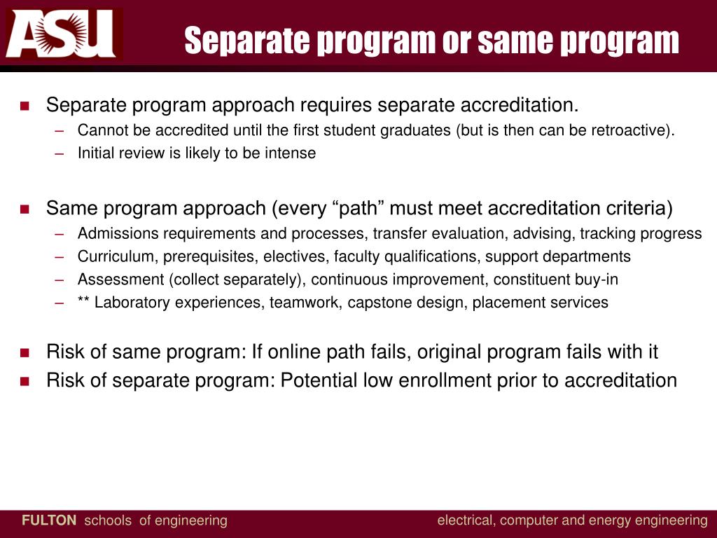 Separate program or same program • Separate program approach requires separate accreditation. • Cannot be accredited until the first student graduates (but is then can be retroactive). • Initial review is likely to be intense • Same program approach (every “path” must meet accreditation criteria) • Admissions requirements and processes, transfer evaluation, advising, tracking progress • Curriculum, prerequisites, electives, faculty qualifications, support departments • Assessment (collect separately), continuous improvement, constituent buy-in • ** Laboratory experiences, teamwork, capstone design, placement services • Risk of same program: If online path fails, original program fails with it • Risk of separate program: Potential low enrollment prior to accreditation