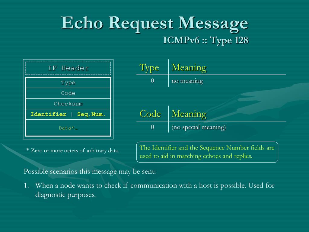Echo Request MessageICMPv6 :: Type 128 The Identifier and the Sequence Number fields are used to aid in matching echoes and replies. * Zero or more octets of arbitrary data. • Possible scenarios this message may be sent: • When a node wants to check if communication with a host is possible. Used for diagnostic purposes.