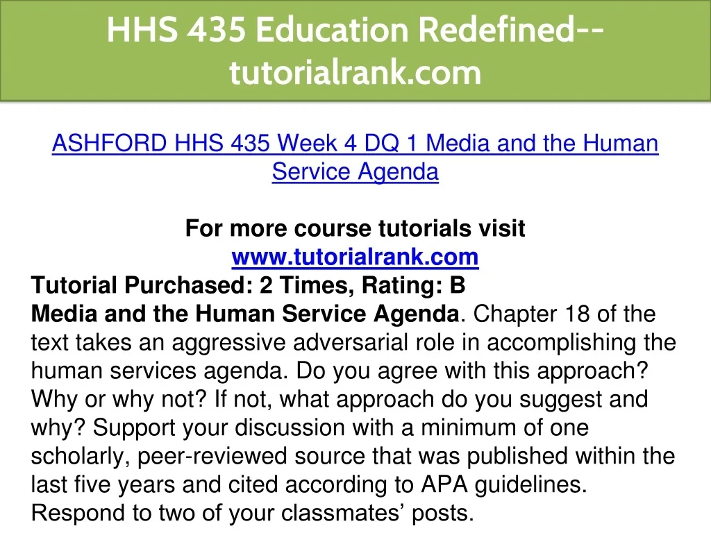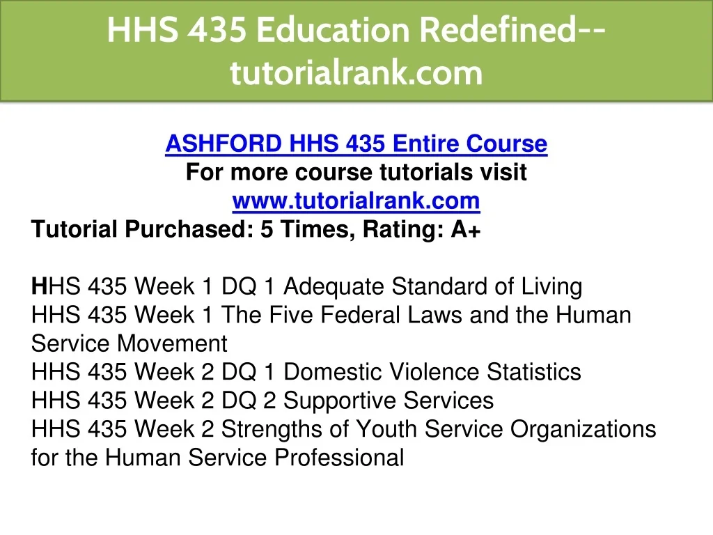 HHS 435 Education Redefined--tutorialrank.com ASHFORD HHS 435 Entire Course For more course tutorials visit www.tutorialrank.com Tutorial Purchased: 5 Times, Rating: A+ HHS 435 Week 1 DQ 1 Adequate Standard of Living HHS 435 Week 1 The Five Federal Laws and the Human Service Movement HHS 435 Week 2 DQ 1 Domestic Violence Statistics HHS 435 Week 2 DQ 2 Supportive Services HHS 435 Week 2 Strengths of Youth Service Organizations for the Human Service Professional