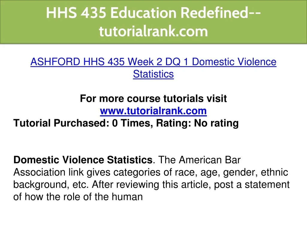 HHS 435 Education Redefined--tutorialrank.com ASHFORD HHS 435 Week 2 DQ 1 Domestic Violence Statistics For more course tutorials visit www.tutorialrank.com Tutorial Purchased: 0 Times, Rating: No rating Domestic Violence Statistics. The American Bar Association link gives categories of race, age, gender, ethnic background, etc. After reviewing this article, post a statement of how the role of the human