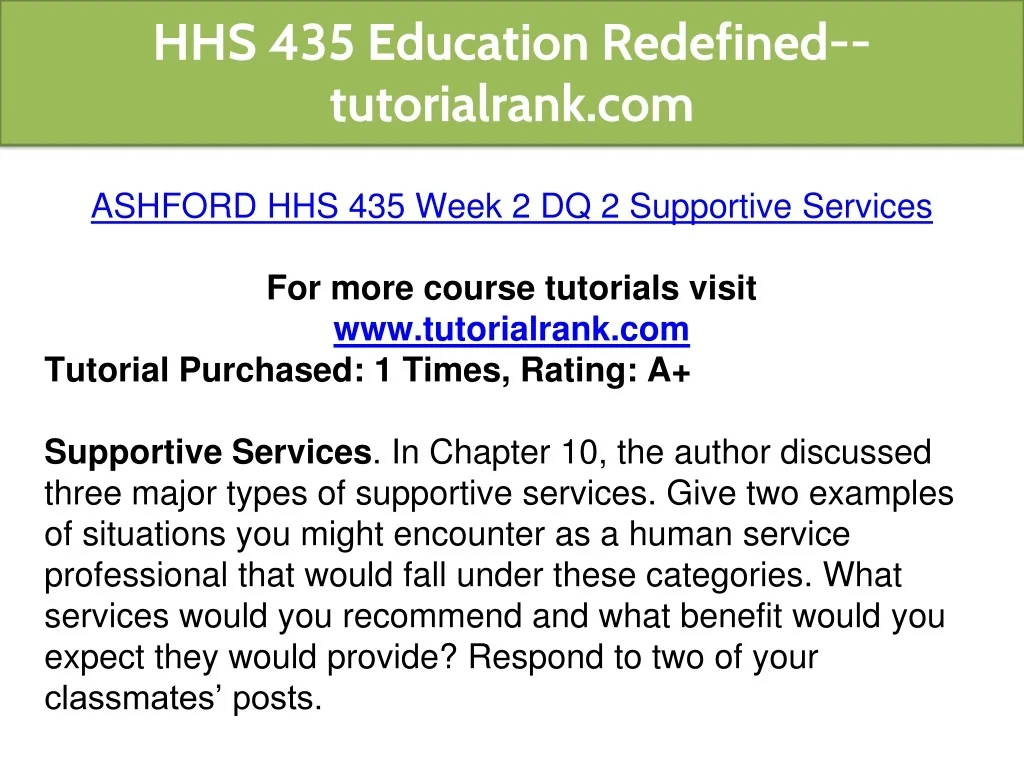 HHS 435 Education Redefined--tutorialrank.com ASHFORD HHS 435 Week 2 DQ 2 Supportive Services For more course tutorials visit www.tutorialrank.com Tutorial Purchased: 1 Times, Rating: A+ Supportive Services. In Chapter 10, the author discussed three major types of supportive services. Give two examples of situations you might encounter as a human service professional that would fall under these categories. What services would you recommend and what benefit would you expect they would provide? Respond to two of your classmates’ posts.