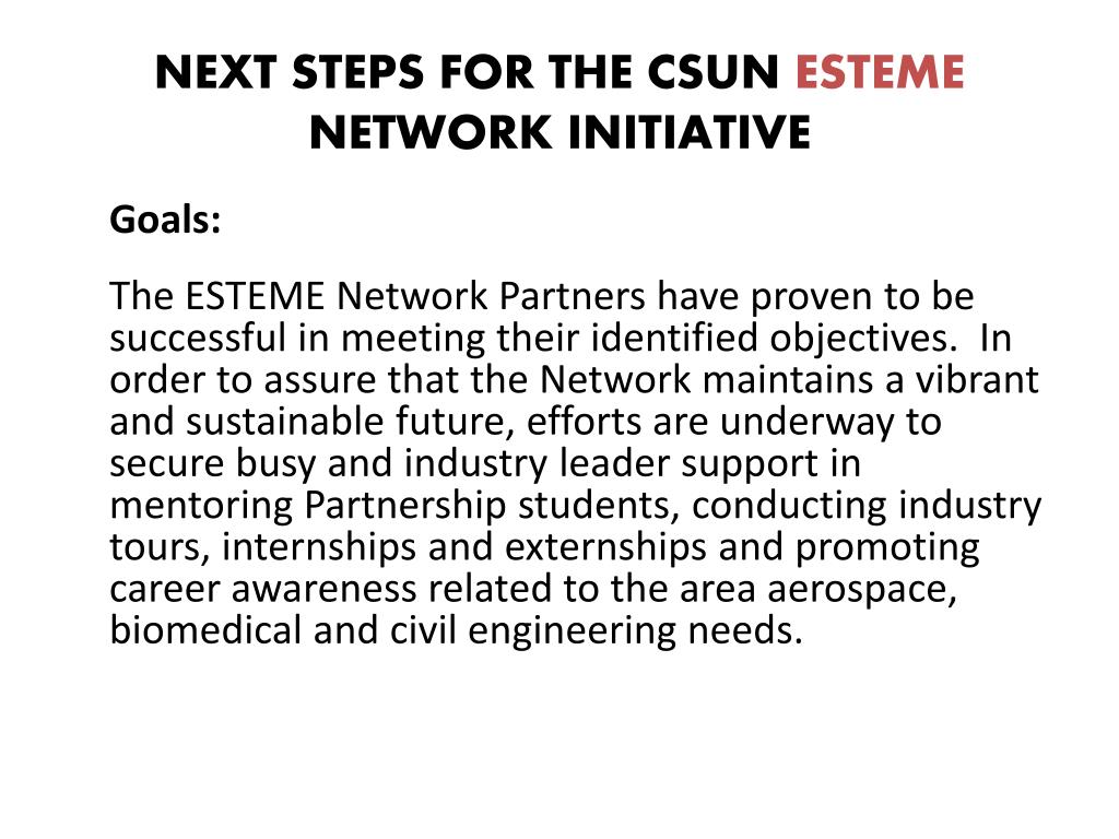 NEXT STEPS FOR THE CSUN ESTEMENETWORK INITIATIVE Goals: The ESTEME Network Partners have proven to be successful in meeting their identified objectives. In order to assure that the Network maintains a vibrant and sustainable future, efforts are underway to secure busy and industry leader support in mentoring Partnership students, conducting industry tours, internships and externships and promoting career awareness related to the area aerospace, biomedical and civil engineering needs.