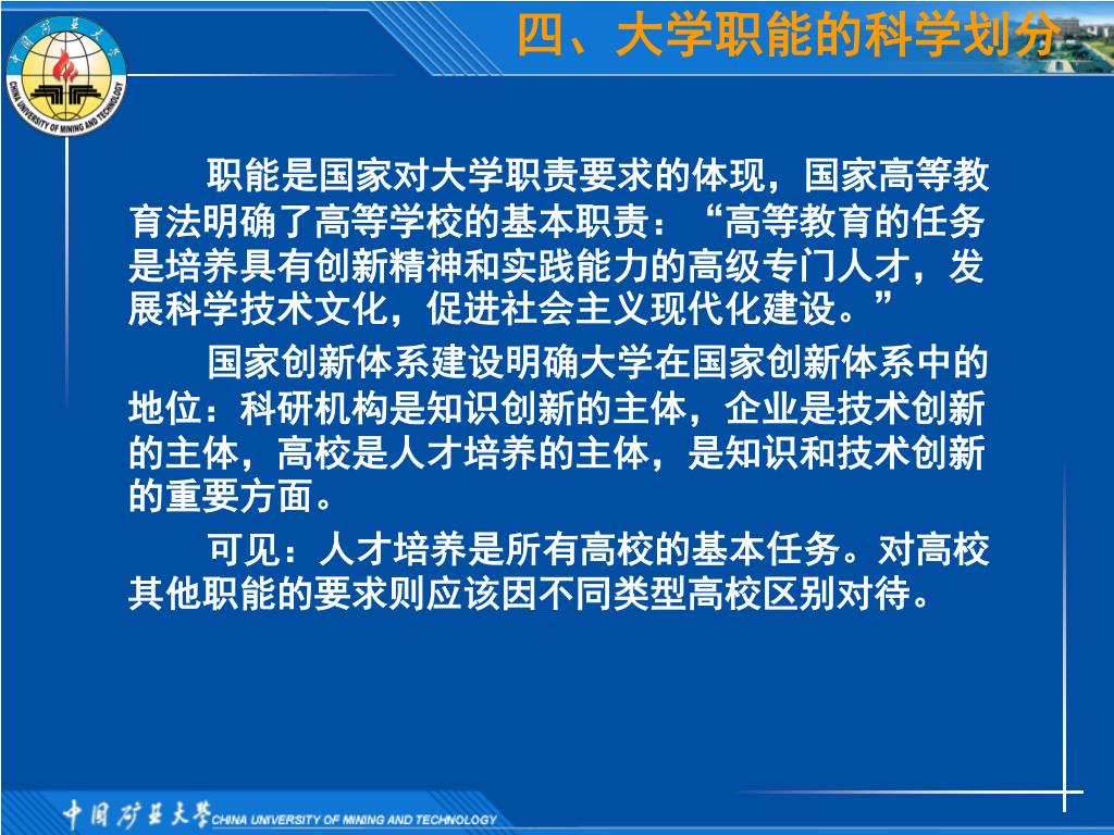 四、大学职能的科学划分 • 职能是国家对大学职责要求的体现,国家高等教育法明确了高等学校的基本职责:“高等教育的任务是培养具有创新精神和实践能力的高级专门人才,发展科学技术文化,促进社会主义现代化建设。” • 国家创新体系建设明确大学在国家创新体系中的地位:科研机构是知识创新的主体,企业是技术创新的主体,高校是人才培养的主体,是知识和技术创新的重要方面。 • 可见:人才培养是所有高校的基本任务。对高校其他职能的要求则应该因不同类型高校区别对待。