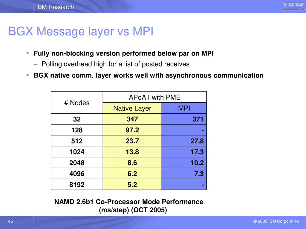 BGX Message layer vs MPI • Fully non-blocking version performed below par on MPI • Polling overhead high for a list of posted receives • BGX native comm. layer works well with asynchronous communication NAMD 2.6b1 Co-Processor Mode Performance (ms/step) (OCT 2005)