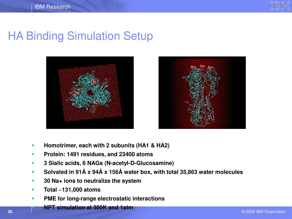 HA Binding Simulation Setup • Homotrimer, each with 2 subunits (HA1 & HA2) • Protein: 1491 residues, and 23400 atoms • 3 Sialic acids, 6 NAGs (N-acetyl-D-Glucosamine) • Solvated in 91Å x 94Å x 156Å water box, with total 35,863 water molecules • 30 Na+ ions to neutralize the system • Total ~131,000 atoms • PME for long-range electrostatic interactions • NPT simulation at 300K and 1atm