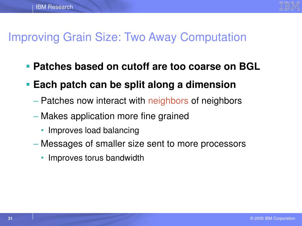 Improving Grain Size: Two Away Computation • Patches based on cutoff are too coarse on BGL • Each patch can be split along a dimension • Patches now interact with neighbors of neighbors • Makes application more fine grained • Improves load balancing • Messages of smaller size sent to more processors • Improves torus bandwidth