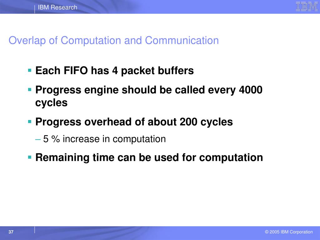 Overlap of Computation and Communication • Each FIFO has 4 packet buffers • Progress engine should be called every 4000 cycles • Progress overhead of about 200 cycles • 5 % increase in computation • Remaining time can be used for computation