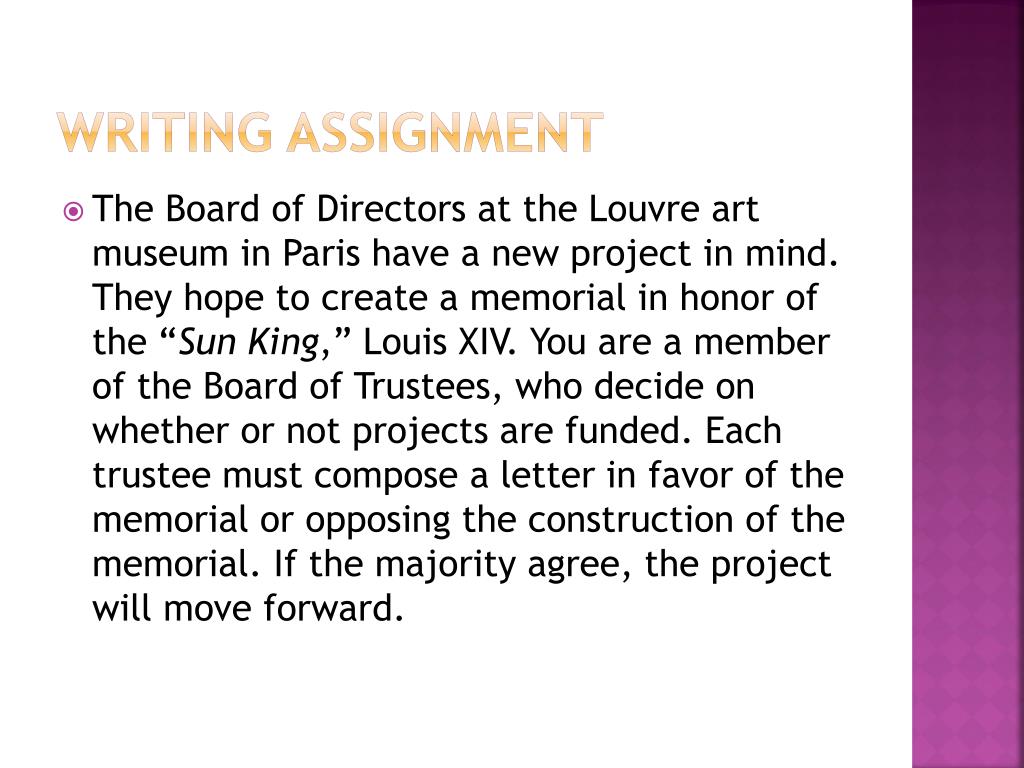Writing Assignment • The Board of Directors at the Louvre art museum in Paris have a new project in mind. They hope to create a memorial in honor of the “Sun King,” Louis XIV. You are a member of the Board of Trustees, who decide on whether or not projects are funded. Each trustee must compose a letter in favor of the memorial or opposing the construction of the memorial. If the majority agree, the project will move forward.