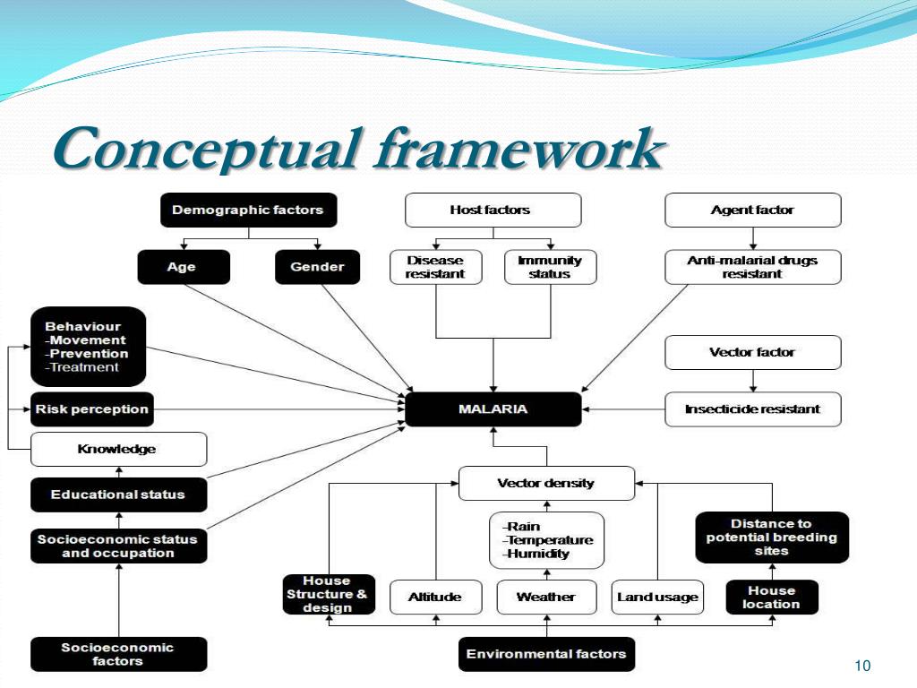 Literature review • Incardona et al. (2007) showed association between history of movement to the jungle with malaria infection. • House located >500 m from forest fringe is protective factor towards malaria (Brooker et al. 2004) • Water bodies provide suitable habitat for malaria vector thus increase risk of infection (Guthmann et al. 2002) • Konradsen et al. (2003) suggest house built without good structure and design will increase risk of malaria.