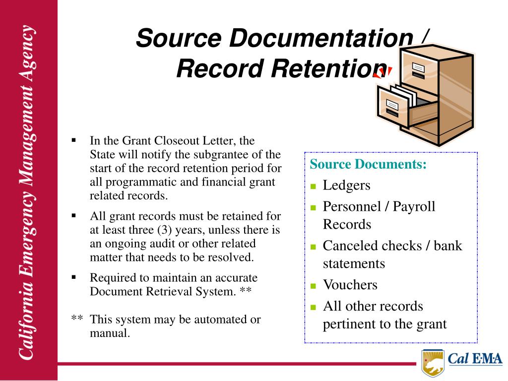 Source Documentation / Record Retention • In the Grant Closeout Letter, the State will notify the subgrantee of the start of the record retention period for all programmatic and financial grant related records. • All grant records must be retained for at least three (3) years, unless there is an ongoing audit or other related matter that needs to be resolved. • Required to maintain an accurate Document Retrieval System. ** ** This system may be automated or manual.