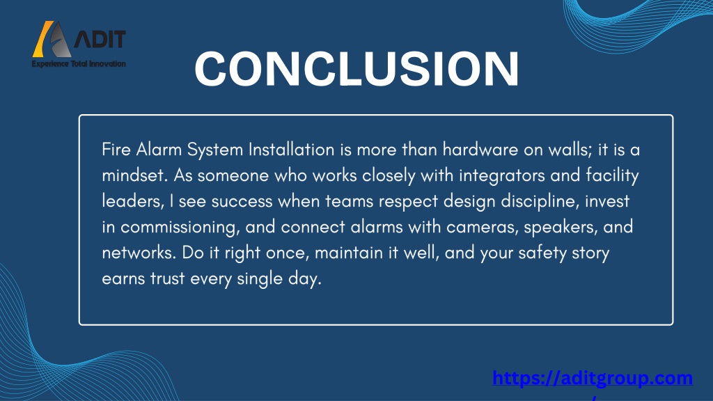 CONCLUSION Fire Alarm System Installation is more than hardware on walls; it is a mindset. As someone who works closely with integrators and facility leaders, I see success when teams respect design discipline, invest in commissioning, and connect alarms with cameras, speakers, and networks. Do it right once, maintain it well, and your safety story earns trust every single day. https://aditgroup.com/