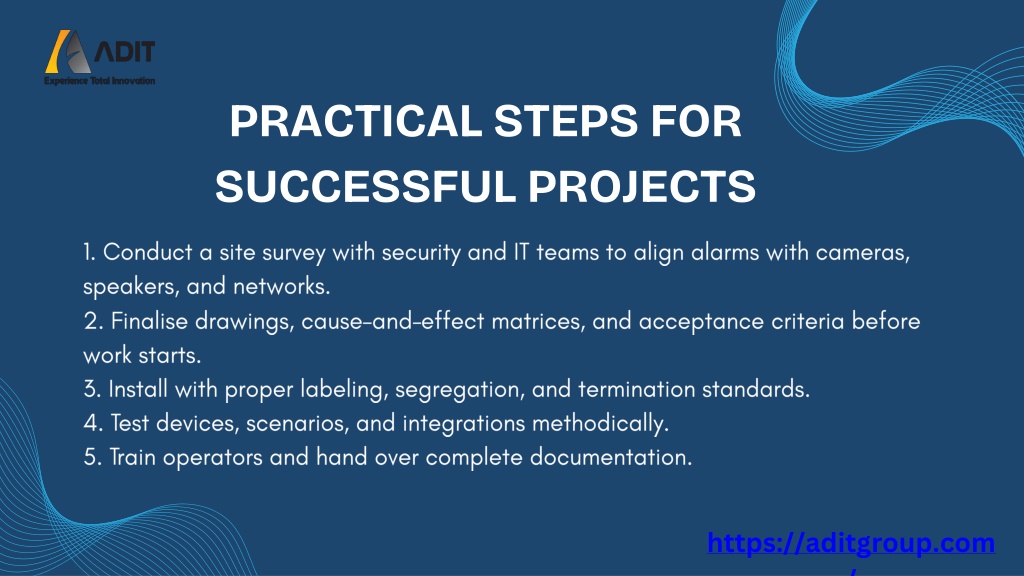 PRACTICAL STEPS FOR SUCCESSFUL PROJECTS 1. Conduct a site survey with security and IT teams to align alarms with cameras, speakers, and networks. 2. Finalise drawings, cause-and-effect matrices, and acceptance criteria before work starts. 3. Install with proper labeling, segregation, and termination standards. 4. Test devices, scenarios, and integrations methodically. 5. Train operators and hand over complete documentation. https://aditgroup.com/