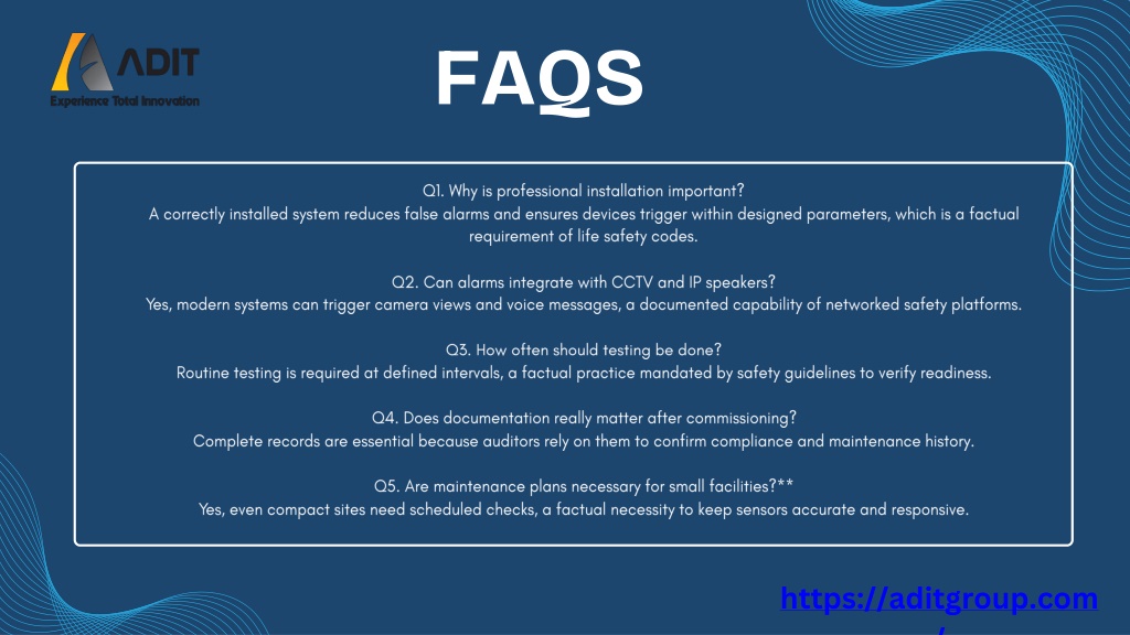 FAQS Q1. Why is professional installation important? A correctly installed system reduces false alarms and ensures devices trigger within designed parameters, which is a factual requirement of life safety codes. Q2. Can alarms integrate with CCTV and IP speakers? Yes, modern systems can trigger camera views and voice messages, a documented capability of networked safety platforms. Q3. How often should testing be done? Routine testing is required at defined intervals, a factual practice mandated by safety guidelines to verify readiness. Q4. Does documentation really matter after commissioning? Complete records are essential because auditors rely on them to confirm compliance and maintenance history. Q5. Are maintenance plans necessary for small facilities?** Yes, even compact sites need scheduled checks, a factual necessity to keep sensors accurate and responsive. https://aditgroup.com/