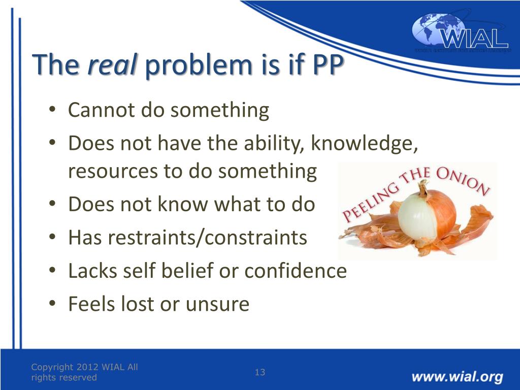 The real problem is if PP • Cannot do something • Does not have the ability, knowledge, resources to do something • Does not know what to do • Has restraints/constraints • Lacks self belief or confidence • Feels lost or unsure