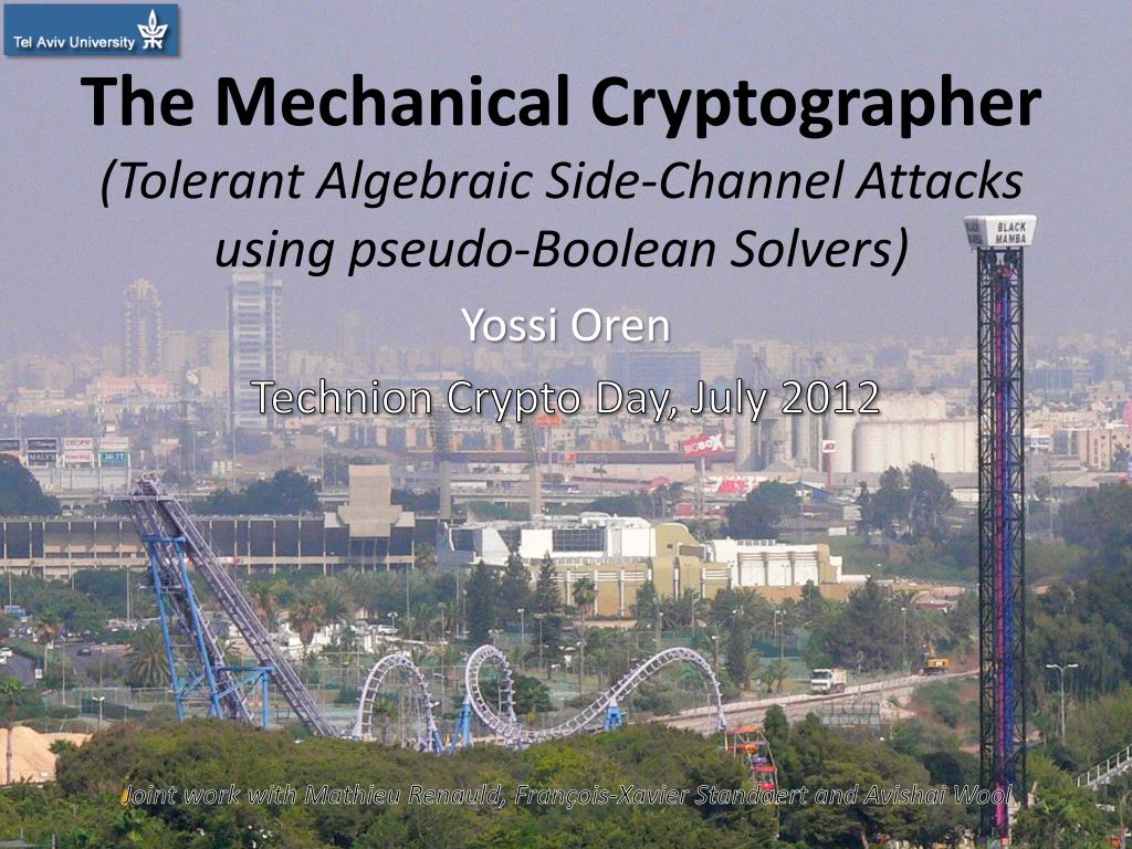 The Mechanical Cryptographer(Tolerant Algebraic Side-Channel Attacks using pseudo-Boolean Solvers) Yossi Oren Technion Crypto Day, July 2012 Joint work with Mathieu Renauld, François-Xavier Standaert and Avishai Wool