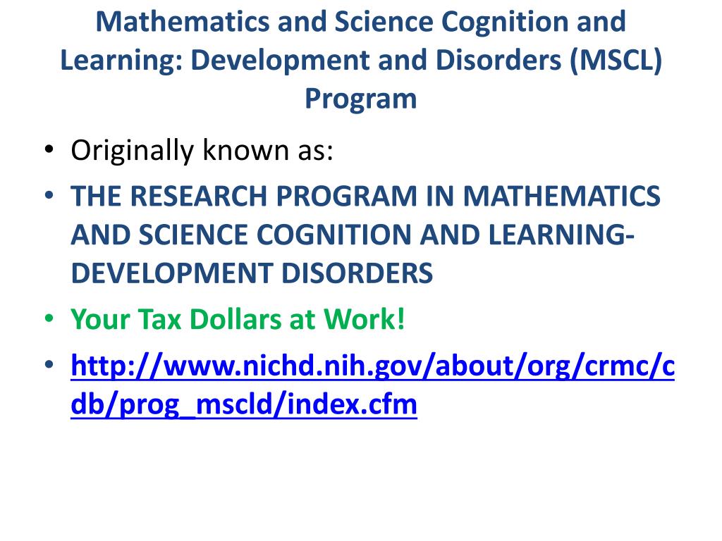 Mathematics and Science Cognition and Learning: Development and Disorders (MSCL) Program • Originally known as: • THE RESEARCH PROGRAM IN MATHEMATICS AND SCIENCE COGNITION AND LEARNING-DEVELOPMENT DISORDERS • Your Tax Dollars at Work! • http://www.nichd.nih.gov/about/org/crmc/cdb/prog_mscld/index.cfm