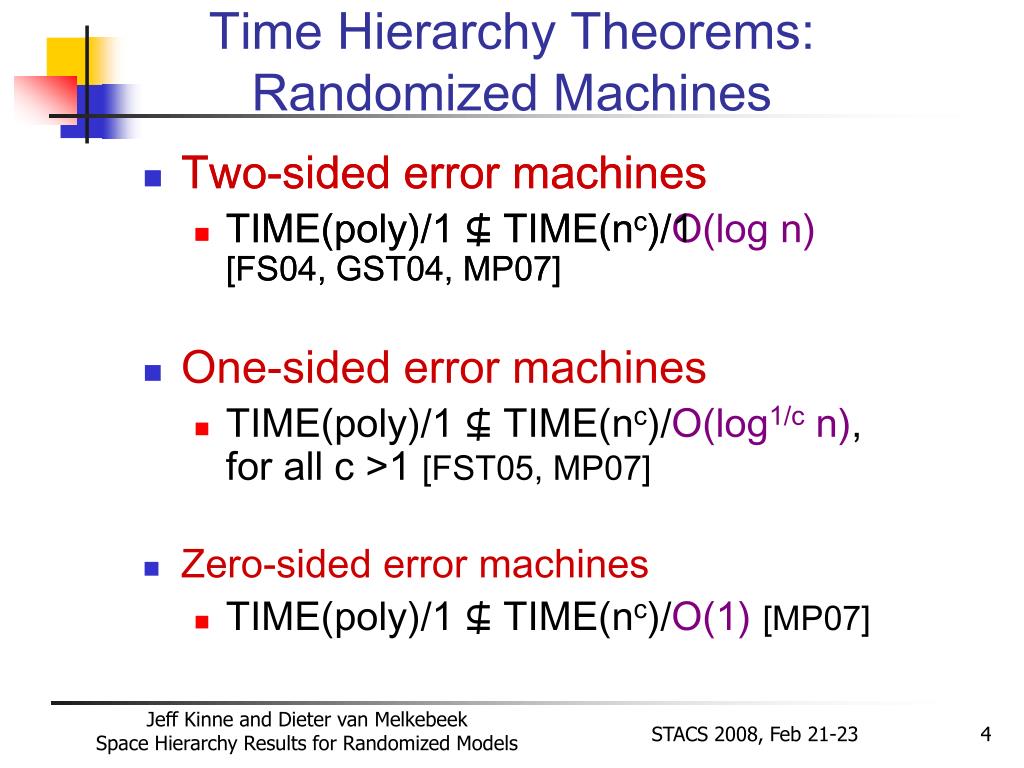 Time Hierarchy Theorems:Randomized Machines • Two-sided error machines • TIME(poly)/1 ⊈ TIME(nc)/O(log n)[FS04, GST04, MP07] • One-sided error machines • TIME(poly)/1 ⊈ TIME(nc)/O(log1/c n), for all c >1 [FST05, MP07] • Zero-sided error machines • TIME(poly)/1 ⊈ TIME(nc)/O(1) [MP07] • Two-sided error machines • TIME(poly)/1 ⊈ TIME(nc)/1[FS04, GST04, MP07] STACS 2008, Feb 21-23