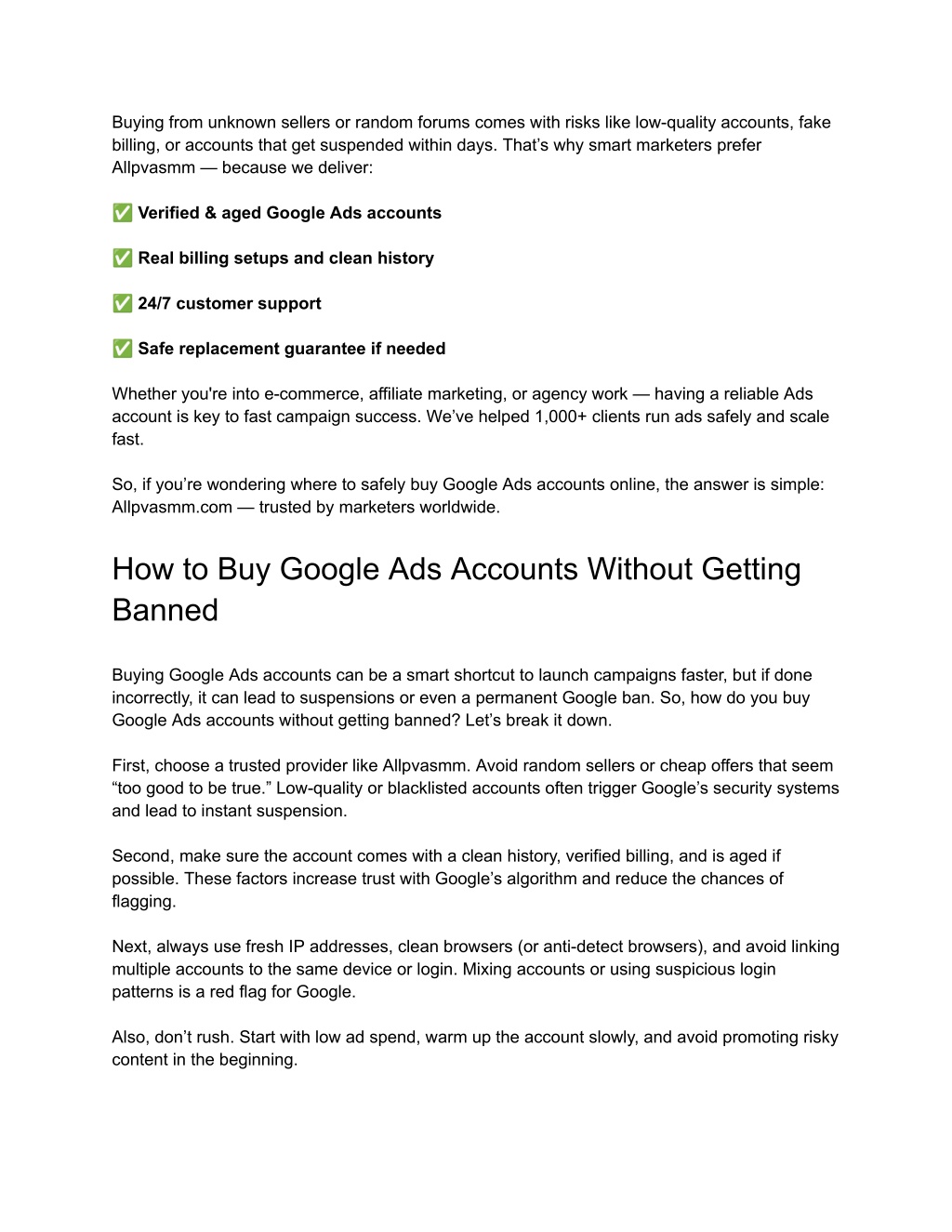 Buying from unknown sellers or random forums comes with risks like low-quality accounts, fake billing, or accounts that get suspended within days. That’s why smart marketers prefer Allpvasmm — because we deliver: ✅ Verified & aged Google Ads accounts ✅ Real billing setups and clean history ✅ 24/7 customer support ✅ Safe replacement guarantee if needed Whether you're into e-commerce, affiliate marketing, or agency work — having a reliable Ads account is key to fast campaign success. We’ve helped 1,000+ clients run ads safely and scale fast. So, if you’re wondering where to safely buy Google Ads accounts online, the answer is simple: Allpvasmm.com — trusted by marketers worldwide. How to Buy Google Ads Accounts Without Getting Banned Buying Google Ads accounts can be a smart shortcut to launch campaigns faster, but if done incorrectly, it can lead to suspensions or even a permanent Google ban. So, how do you buy Google Ads accounts without getting banned? Let’s break it down. First, choose a trusted provider like Allpvasmm. Avoid random sellers or cheap offers that seem “too good to be true.” Low-quality or blacklisted accounts often trigger Google’s security systems and lead to instant suspension. Second, make sure the account comes with a clean history, verified billing, and is aged if possible. These factors increase trust with Google’s algorithm and reduce the chances of flagging. Next, always use fresh IP addresses, clean browsers (or anti-detect browsers), and avoid linking multiple accounts to the same device or login. Mixing accounts or using suspicious login patterns is a red flag for Google. Also, don’t rush. Start with low ad spend, warm up the account slowly, and avoid promoting risky content in the beginning.