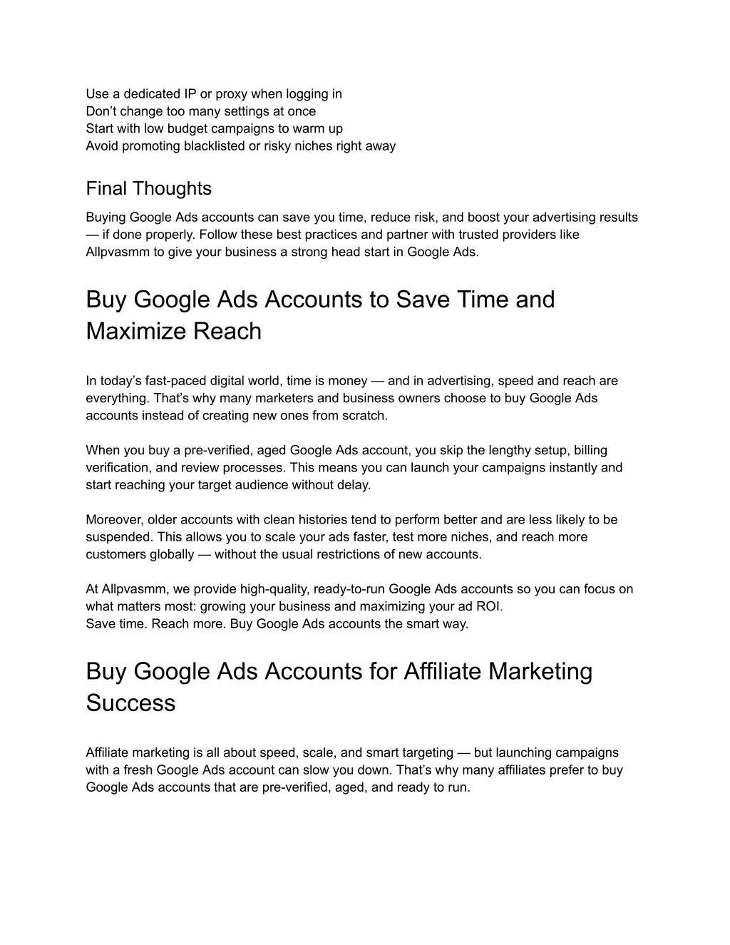 Use a dedicated IP or proxy when logging in Don’t change too many settings at once Start with low budget campaigns to warm up Avoid promoting blacklisted or risky niches right away Final Thoughts Buying Google Ads accounts can save you time, reduce risk, and boost your advertising results — if done properly. Follow these best practices and partner with trusted providers like Allpvasmm to give your business a strong head start in Google Ads. Buy Google Ads Accounts to Save Time and Maximize Reach In today’s fast-paced digital world, time is money — and in advertising, speed and reach are everything. That’s why many marketers and business owners choose to buy Google Ads accounts instead of creating new ones from scratch. When you buy a pre-verified, aged Google Ads account, you skip the lengthy setup, billing verification, and review processes. This means you can launch your campaigns instantly and start reaching your target audience without delay. Moreover, older accounts with clean histories tend to perform better and are less likely to be suspended. This allows you to scale your ads faster, test more niches, and reach more customers globally — without the usual restrictions of new accounts. At Allpvasmm, we provide high-quality, ready-to-run Google Ads accounts so you can focus on what matters most: growing your business and maximizing your ad ROI. Save time. Reach more. Buy Google Ads accounts the smart way. Buy Google Ads Accounts for Affiliate Marketing Success Affiliate marketing is all about speed, scale, and smart targeting — but launching campaigns with a fresh Google Ads account can slow you down. That’s why many affiliates prefer to buy Google Ads accounts that are pre-verified, aged, and ready to run.