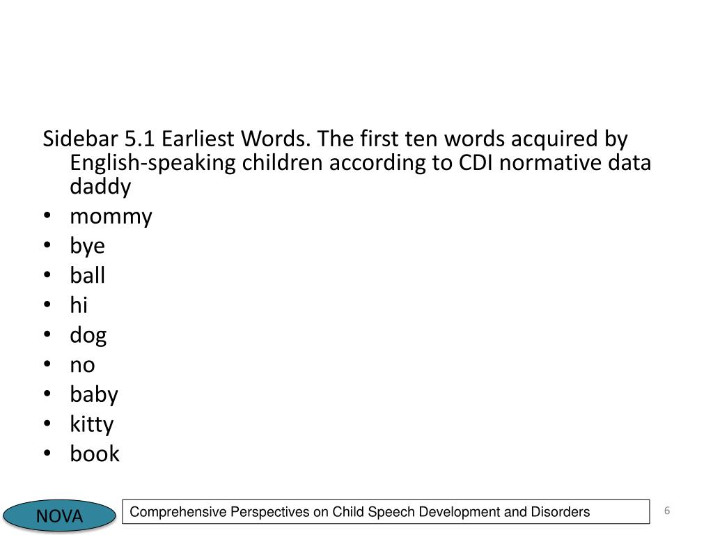 Sidebar 5.1 Earliest Words. The first ten words acquired by English-speaking children according to CDI normative data daddy mommy bye ball hi dog no baby kitty book