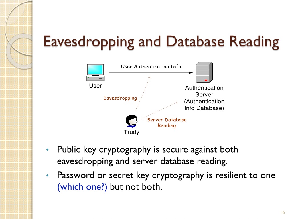 Eavesdropping and Database Reading • Public key cryptography is secure against both eavesdropping and server database reading. • Password or secret key cryptography is resilient to one (which one?) but not both.