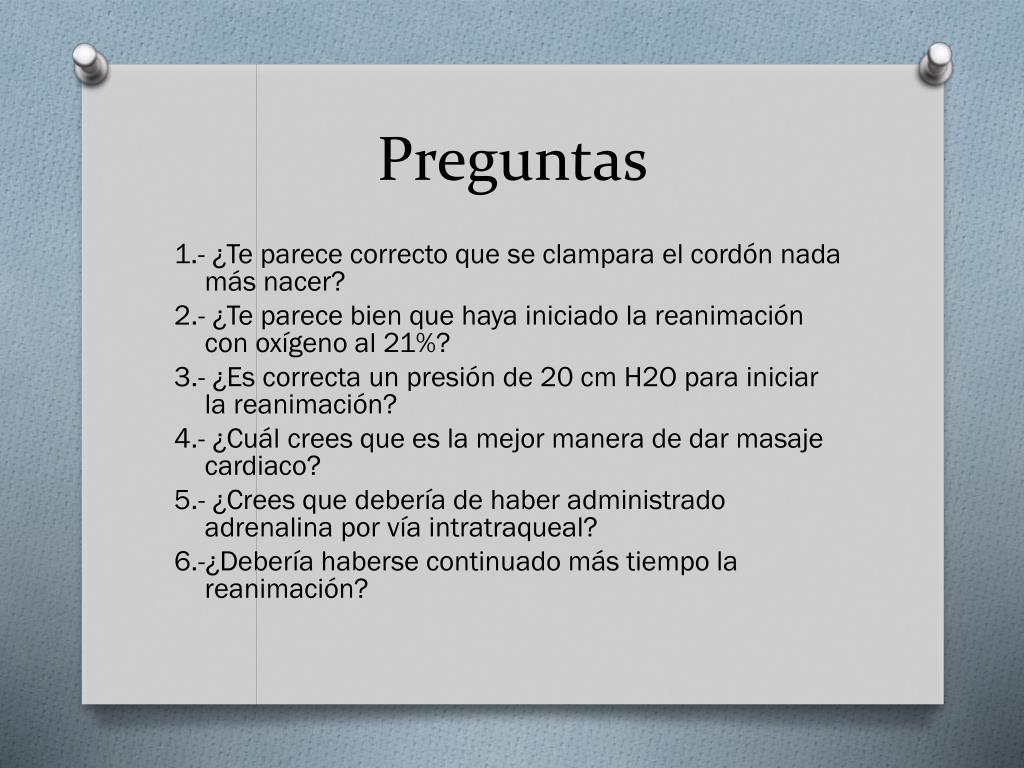 Preguntas 1.- ¿Te parece correcto que se clampara el cordón nada más nacer? 2.- ¿Te parece bien que haya iniciado la reanimación con oxígeno al 21%? 3.- ¿Es correcta un presión de 20 cm H2O para iniciar la reanimación? 4.- ¿Cuál crees que es la mejor manera de dar masaje cardiaco? 5.- ¿Crees que debería de haber administrado adrenalina por vía intratraqueal? 6.-¿Debería haberse continuado más tiempo la reanimación?