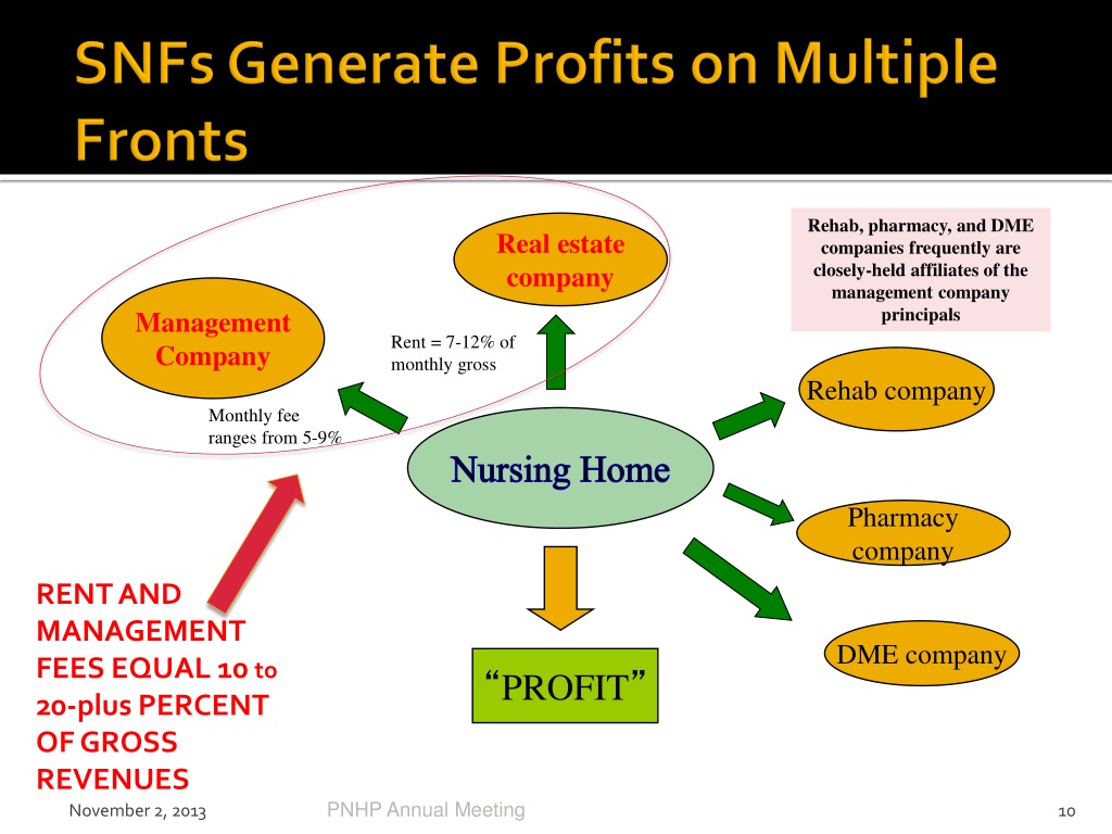 SNFs Generate Profits on Multiple Fronts Rehab, pharmacy, and DME companies frequently are closely-held affiliates of the management company principals Real estate company Management Company Rent = 7-12% of monthly gross Rehab company Monthly fee ranges from 5-9% Nursing Home Pharmacy company RENT AND MANAGEMENT FEES EQUAL 10 to 20-plus PERCENT OF GROSS REVENUES DME company “PROFIT” PNHP Annual Meeting