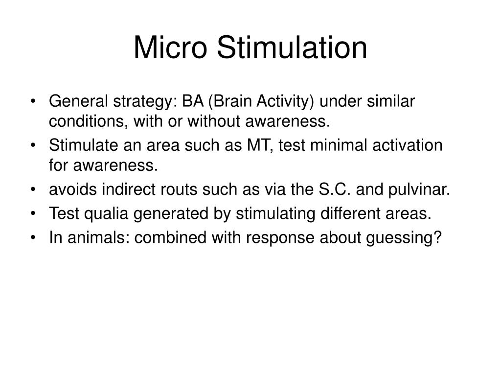 Micro Stimulation • General strategy: BA (Brain Activity) under similar conditions, with or without awareness. • Stimulate an area such as MT, test minimal activation for awareness. • avoids indirect routs such as via the S.C. and pulvinar. • Test qualia generated by stimulating different areas. • In animals: combined with response about guessing?