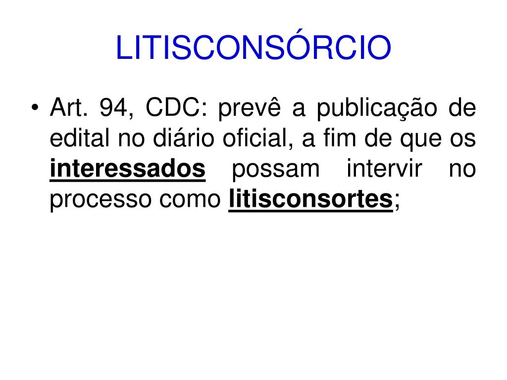 LITISCONSÓRCIO • Art. 94, CDC: prevê a publicação de edital no diário oficial, a fim de que os interessados possam intervir no processo como litisconsortes;