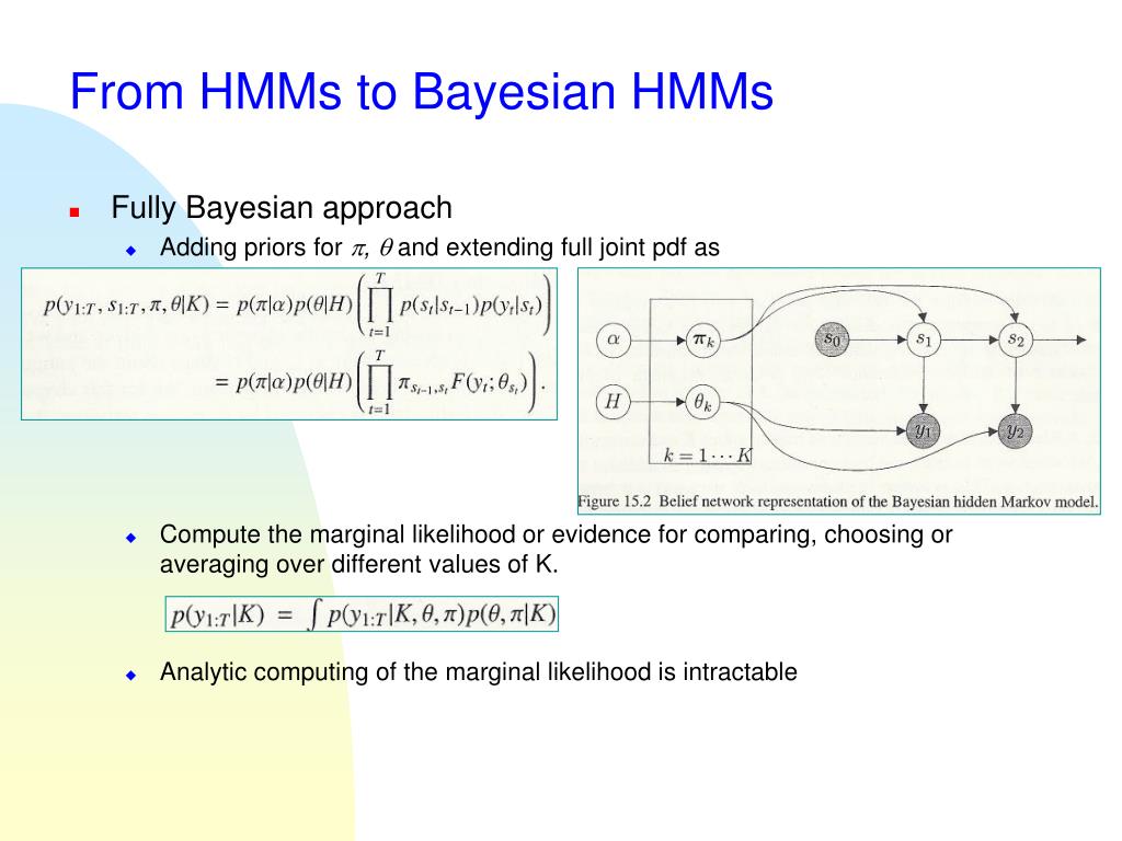 From HMMs to Bayesian HMMs • Fully Bayesian approach • Adding priors for , and extending full joint pdfas • Compute the marginal likelihood or evidence for comparing, choosing or averaging over different values of K. • Analytic computing of the marginal likelihood is intractable
