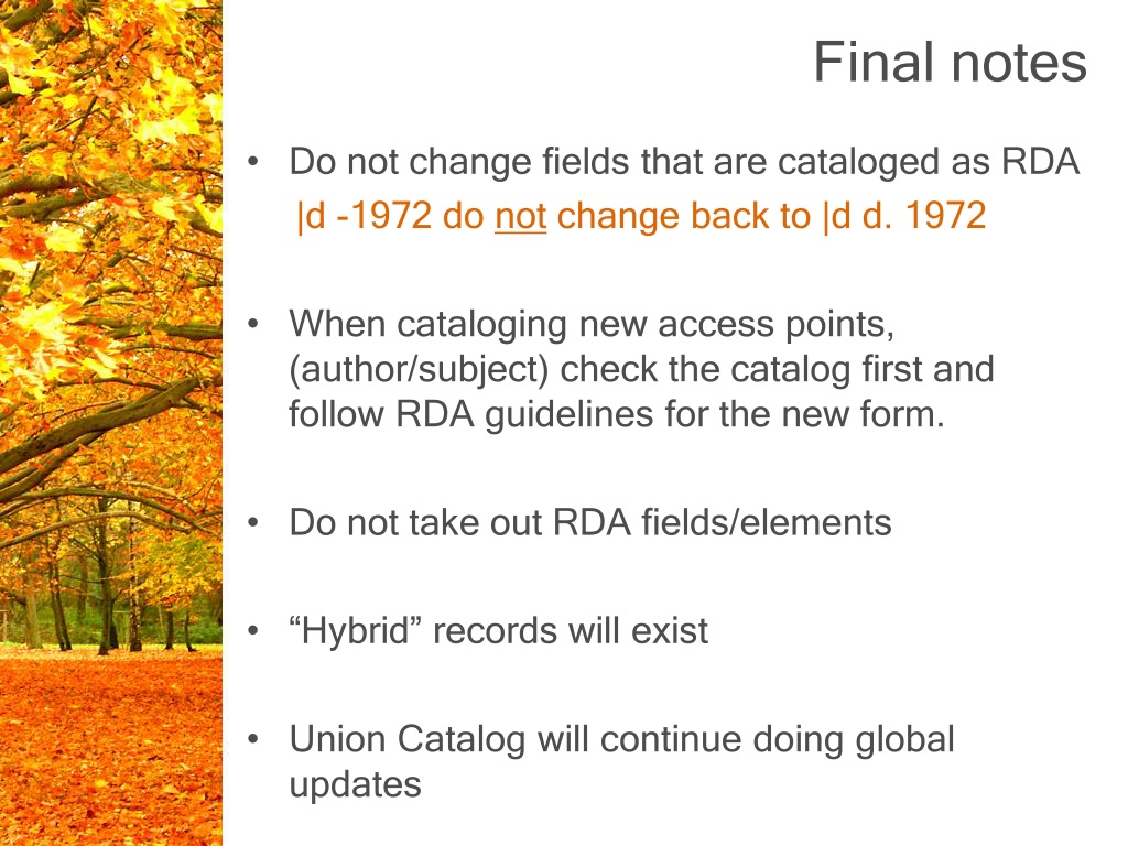 Final notes • Do not change fields that are cataloged as RDA |d -1972 do not change back to |d d. 1972 • When cataloging new access points, (author/subject) check the catalog first and follow RDA guidelines for the new form. • Do not take out RDA fields/elements • “Hybrid” records will exist • Union Catalog will continue doing global updates