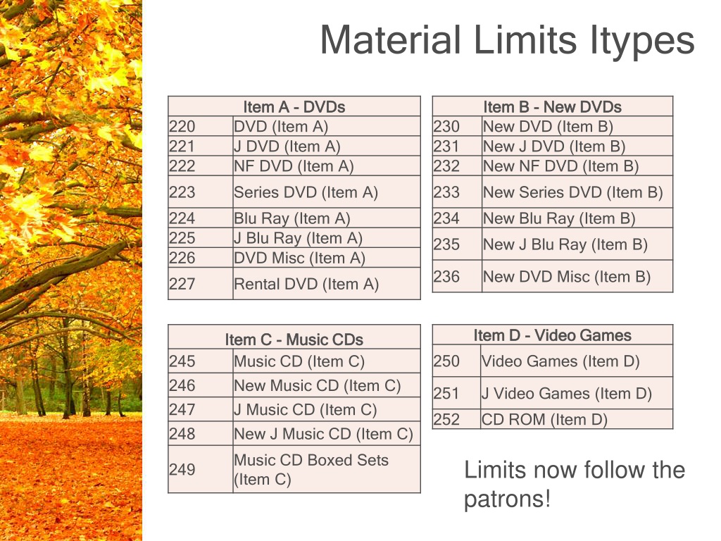 Material Limits Itypes Limits now follow the patrons!