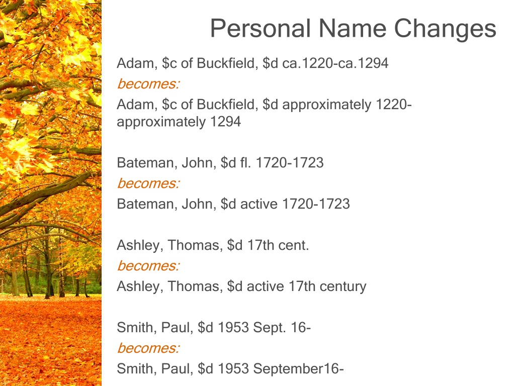 Personal Name Changes Adam, $c of Buckfield, $d ca.1220-ca.1294 becomes: Adam, $c of Buckfield, $d approximately 1220- approximately 1294 Bateman, John, $d fl. 1720-1723 becomes: Bateman, John, $d active 1720-1723 Ashley, Thomas, $d 17th cent. becomes: Ashley, Thomas, $d active 17th century Smith, Paul, $d 1953 Sept. 16- becomes: Smith, Paul, $d 1953 September16-