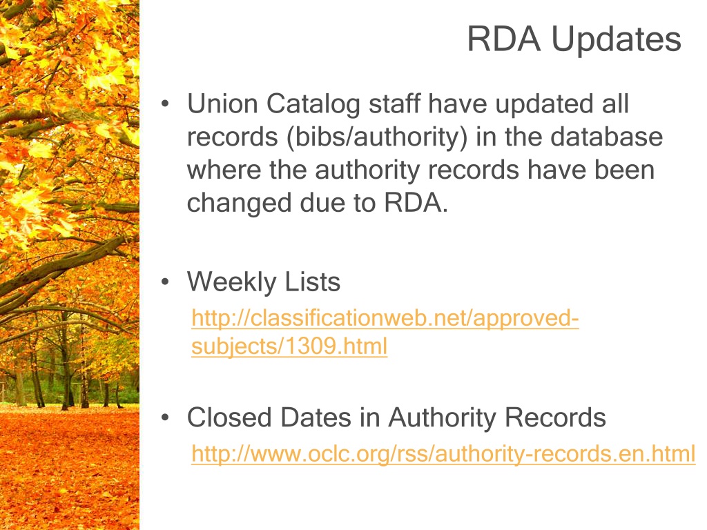 RDA Updates • Union Catalog staff have updated all records (bibs/authority) in the database where the authority records have been changed due to RDA. • Weekly Lists http://classificationweb.net/approved-subjects/1309.html • Closed Dates in Authority Records http://www.oclc.org/rss/authority-records.en.html