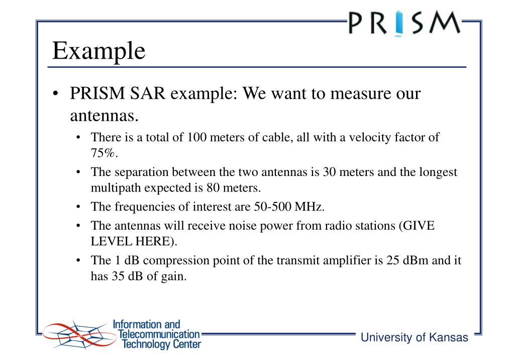 Example • PRISM SAR example: We want to measure our antennas. • There is a total of 100 meters of cable, all with a velocity factor of 75%. • The separation between the two antennas is 30 meters and the longest multipath expected is 80 meters. • The frequencies of interest are 50-500 MHz. • The antennas will receive noise power from radio stations (GIVE LEVEL HERE). • The 1 dB compression point of the transmit amplifier is 25 dBm and it has 35 dB of gain.
