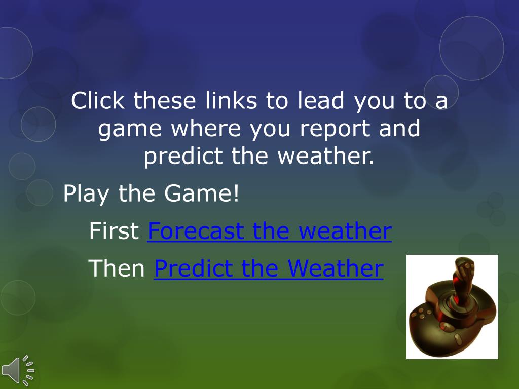 Click these links to lead you to a game where you report and predict the weather. Play the Game! First Forecast the weather Then Predict the Weather