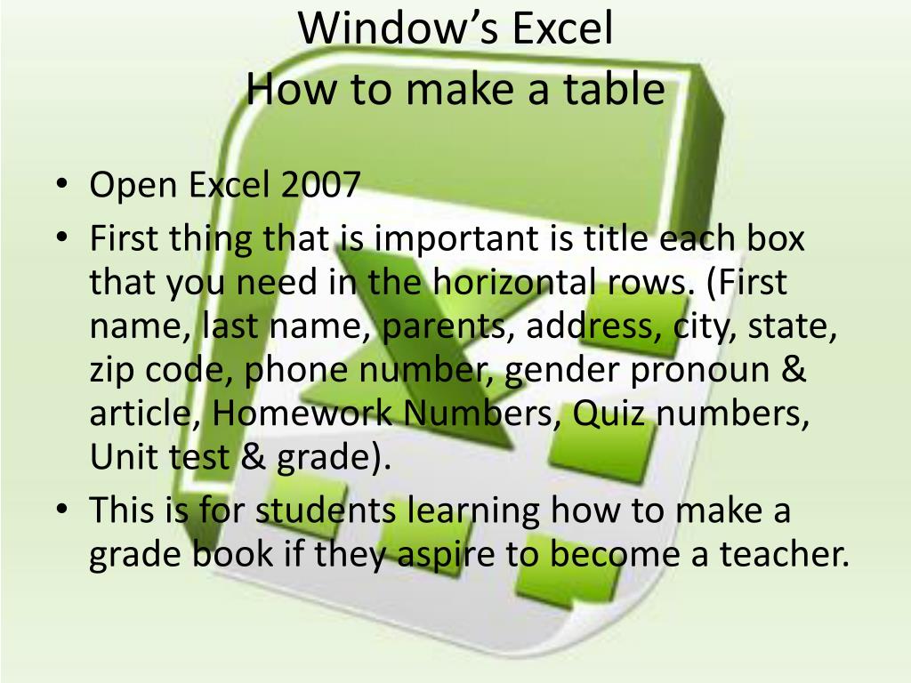 Window’s ExcelHow to make a table • Open Excel 2007 • First thing that is important is title each box that you need in the horizontal rows. (First name, last name, parents, address, city, state, zip code, phone number, gender pronoun & article, Homework Numbers, Quiz numbers, Unit test & grade). • This is for students learning how to make a grade book if they aspire to become a teacher.