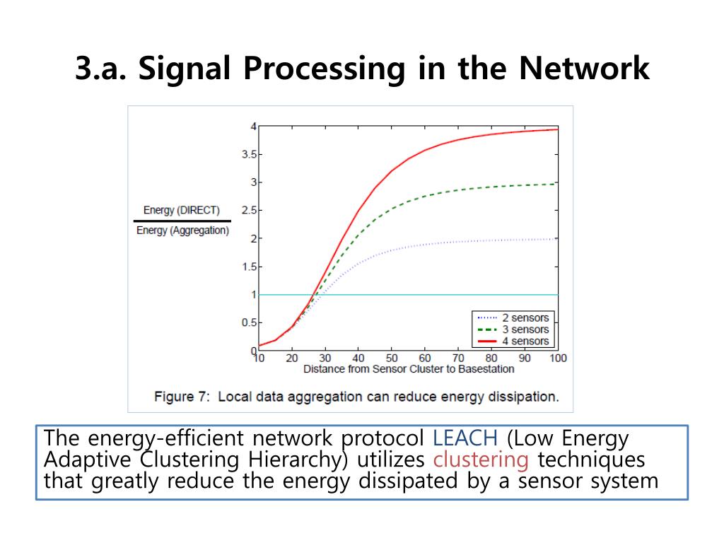 3.a. Signal Processing in the Network The energy-efficient network protocol LEACH (Low Energy Adaptive Clustering Hierarchy) utilizes clusteringtechniques that greatly reduce the energy dissipated by a sensor system