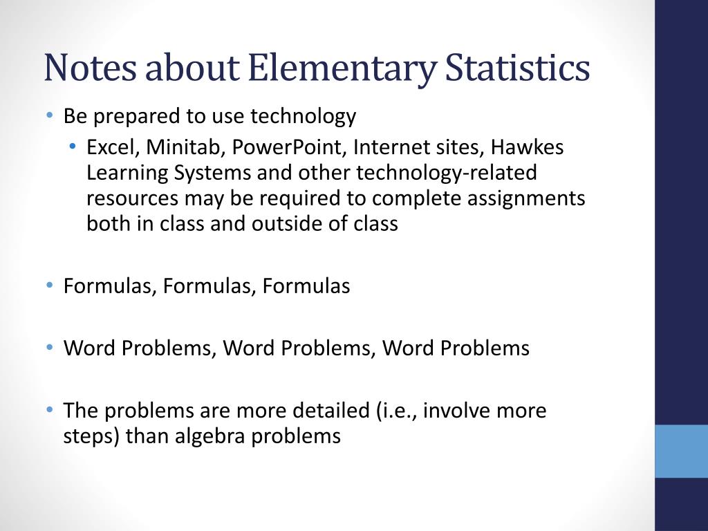 Notes about Elementary Statistics • Be prepared to use technology • Excel, Minitab, PowerPoint, Internet sites, Hawkes Learning Systems and other technology-related resources may be required to complete assignments both in class and outside of class • Formulas, Formulas, Formulas • Word Problems, Word Problems, Word Problems • The problems are more detailed (i.e., involve more steps) than algebra problems